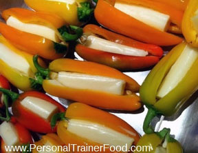- Cut each cheese stick into 3-4 pieces and place each piece inside a mini pepper.