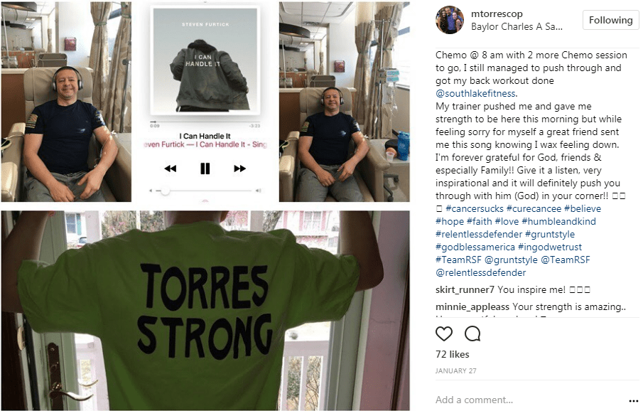 “Chemo @ 8 am with 2 more Chemo sessions to go. I still managed to push through and got my back workout done.”