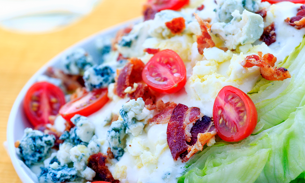 3. Top lettuce with bacon, chicken, blue cheese, grape tomatoes, and dressing.