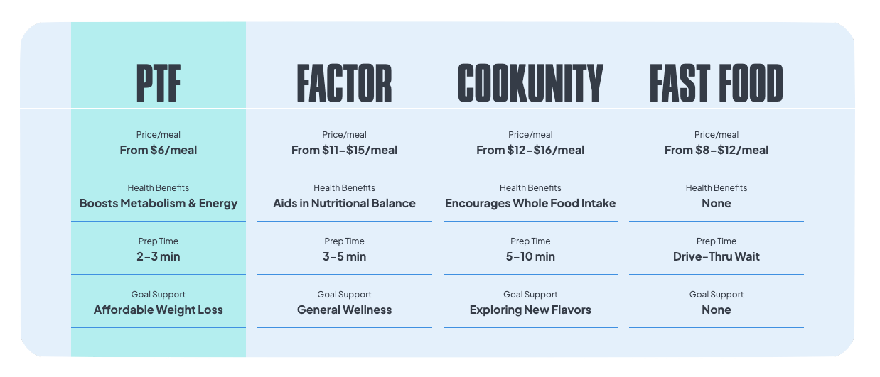 Now compare that to a perfectly portioned Personal Trainer Food meal, which includes the same core ingredients—fully cooked, perfectly portioned, and ready to heat and eat—for just $6 per meal.