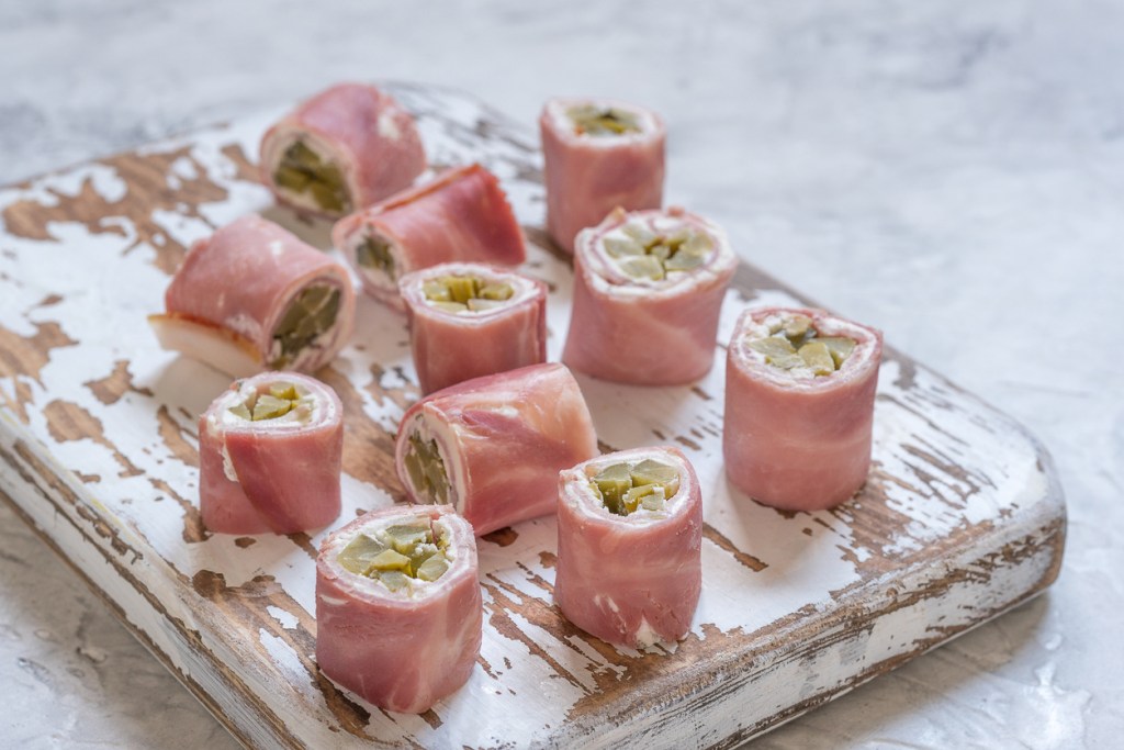 - Place a pickle spear at the end of the ham slice and roll. Cut to desired size once rolled and poke with toothpick to hold shape.